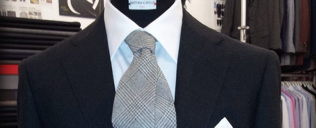– Abito sartoriale 3 bottoni realizzato con tessuto Lanificio Drago Super 130S in grigio scuro fantasia principe di galles.