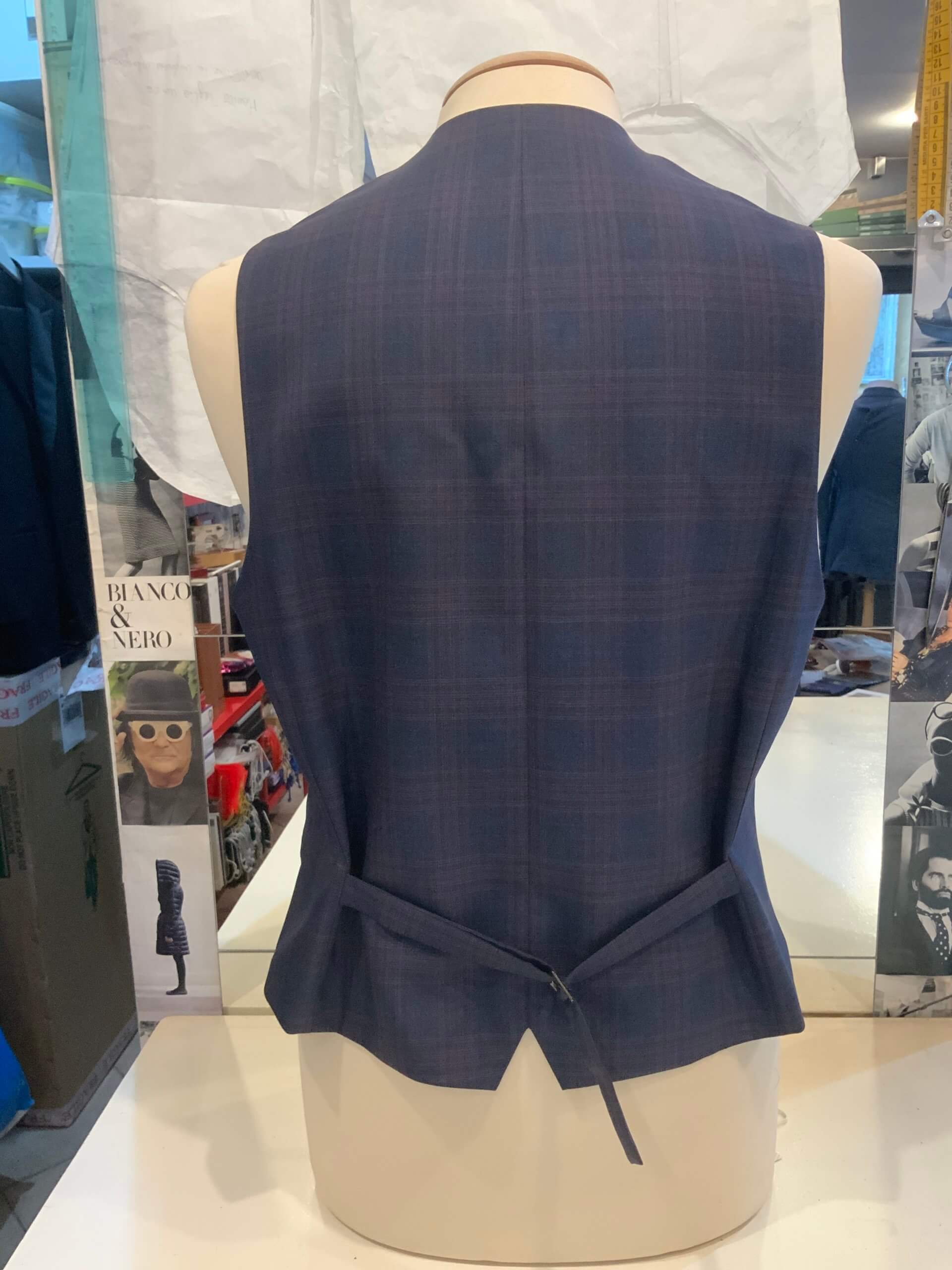 | Modello | Doppio Petto 8 bottoni, fodera interna in Bemberg blu, parte esterna dietro di tessuto, collo sciallato, fondo con punte, due taschini sul davanti, dietro lacci (dello stesso tessuto dell gilet) con clip per la regolazione. |
