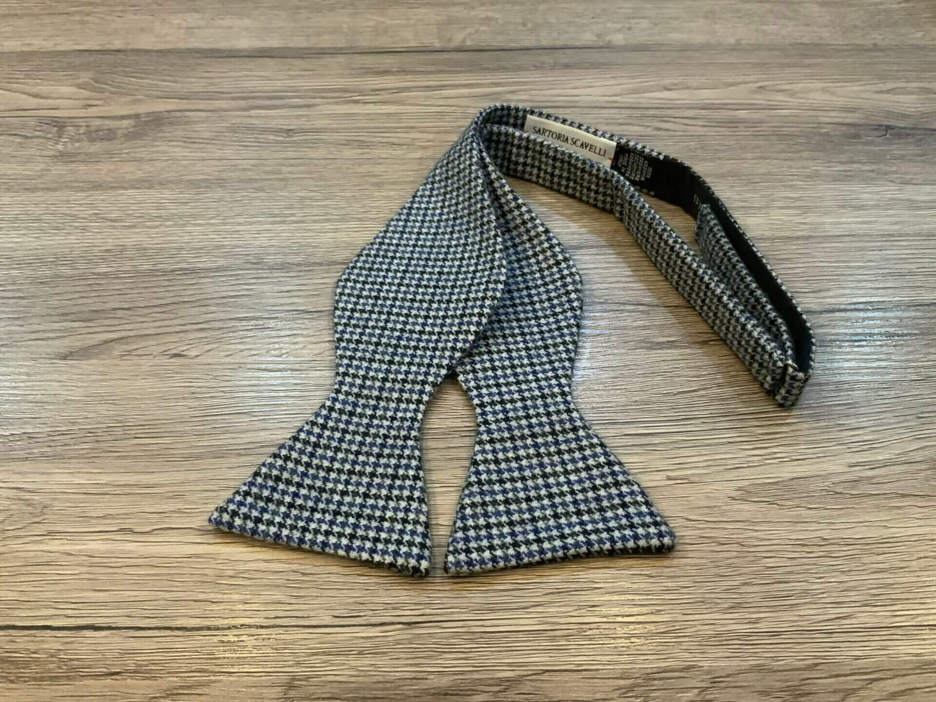 Papillon tagliato e cucito a mano da annodare e con collare regolabile, realizzato in cashmere 100% con fantasia in pied de poule.