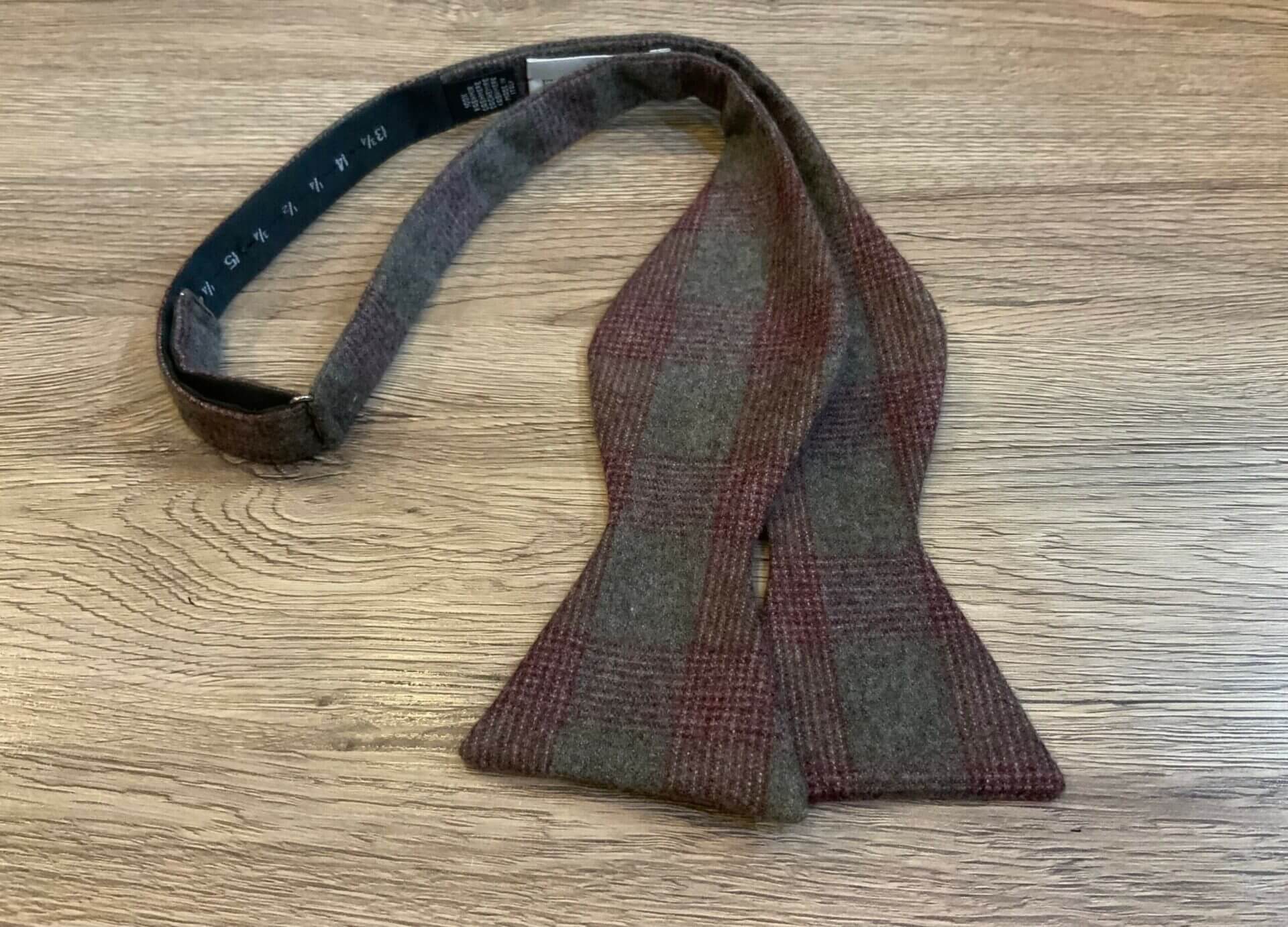 Papillon tagliato e cucito a mano da annodare e con collare regolabile, realizzato in cashmere 100% con fondo colore grigio e righe in bordeaux.