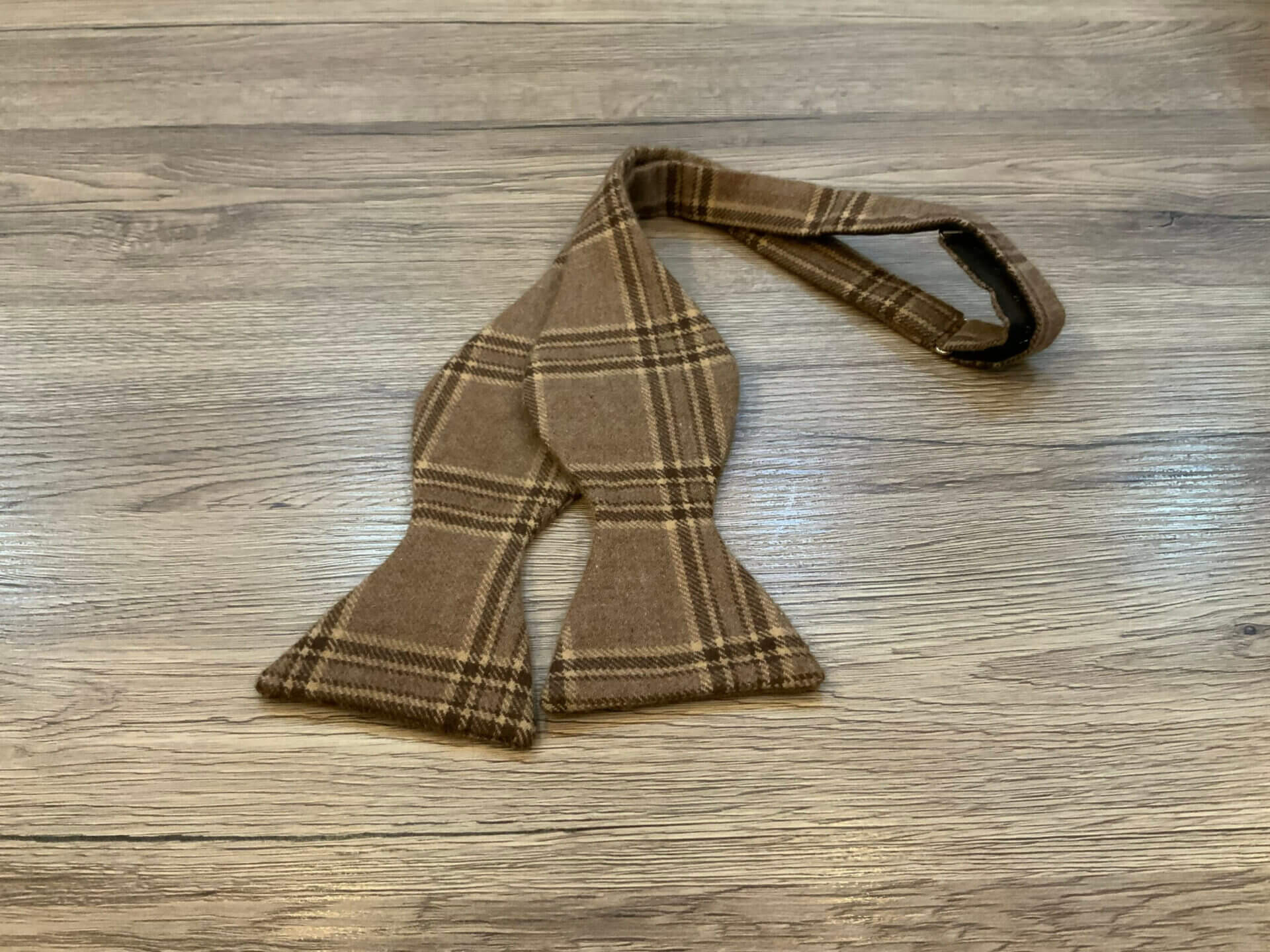 Papillon tagliato e cucito a mano da annodare e con collare regolabile, realizzato in cashmere 100% con fantasia in principe di Galles in beige e marrone.