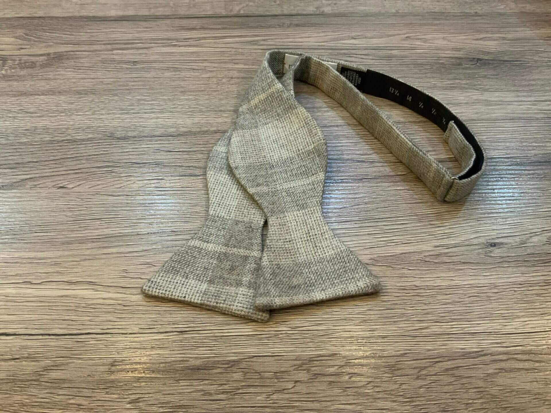 Papillon tagliato e cucito a mano da annodare e con collare regolabile, realizzato in cashmere 100% con fantasia in principe di Galles in chiaro.
