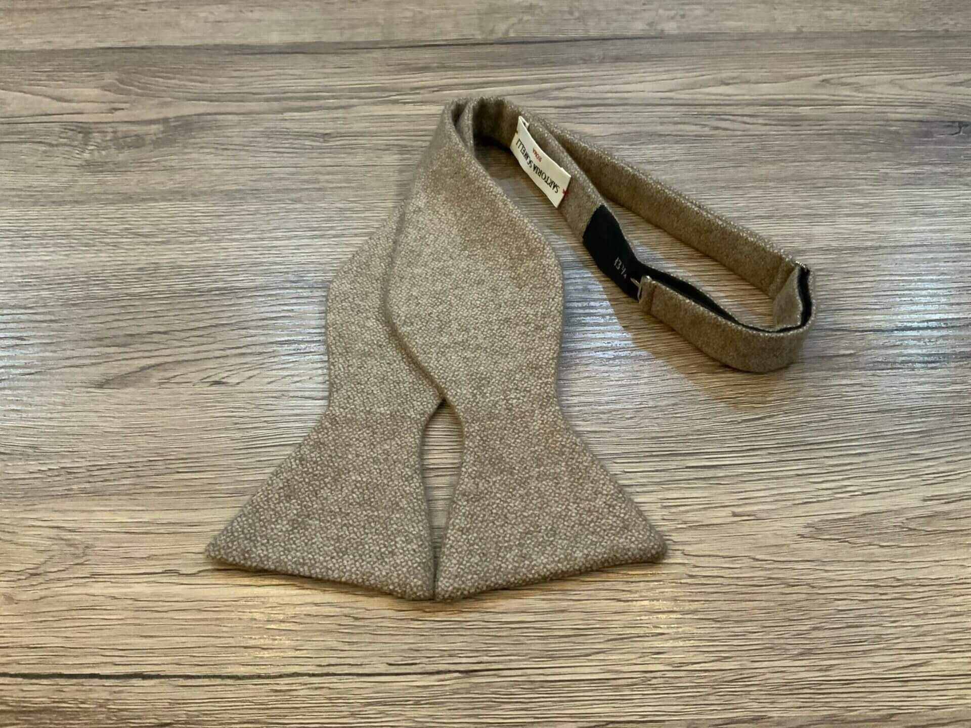Papillon tagliato e cucito a mano da annodare e con collare regolabile, realizzato in cashmere 100% con fondo in beige.