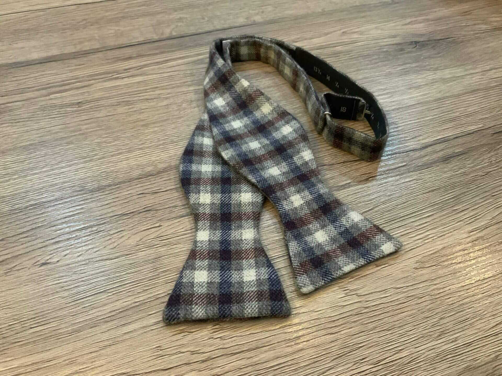 Papillon tagliato e cucito a mano da annodare e con collare regolabile, realizzato in cashmere 100% con fantasia a quadretti blu, bordeaux, grigio e bianco.