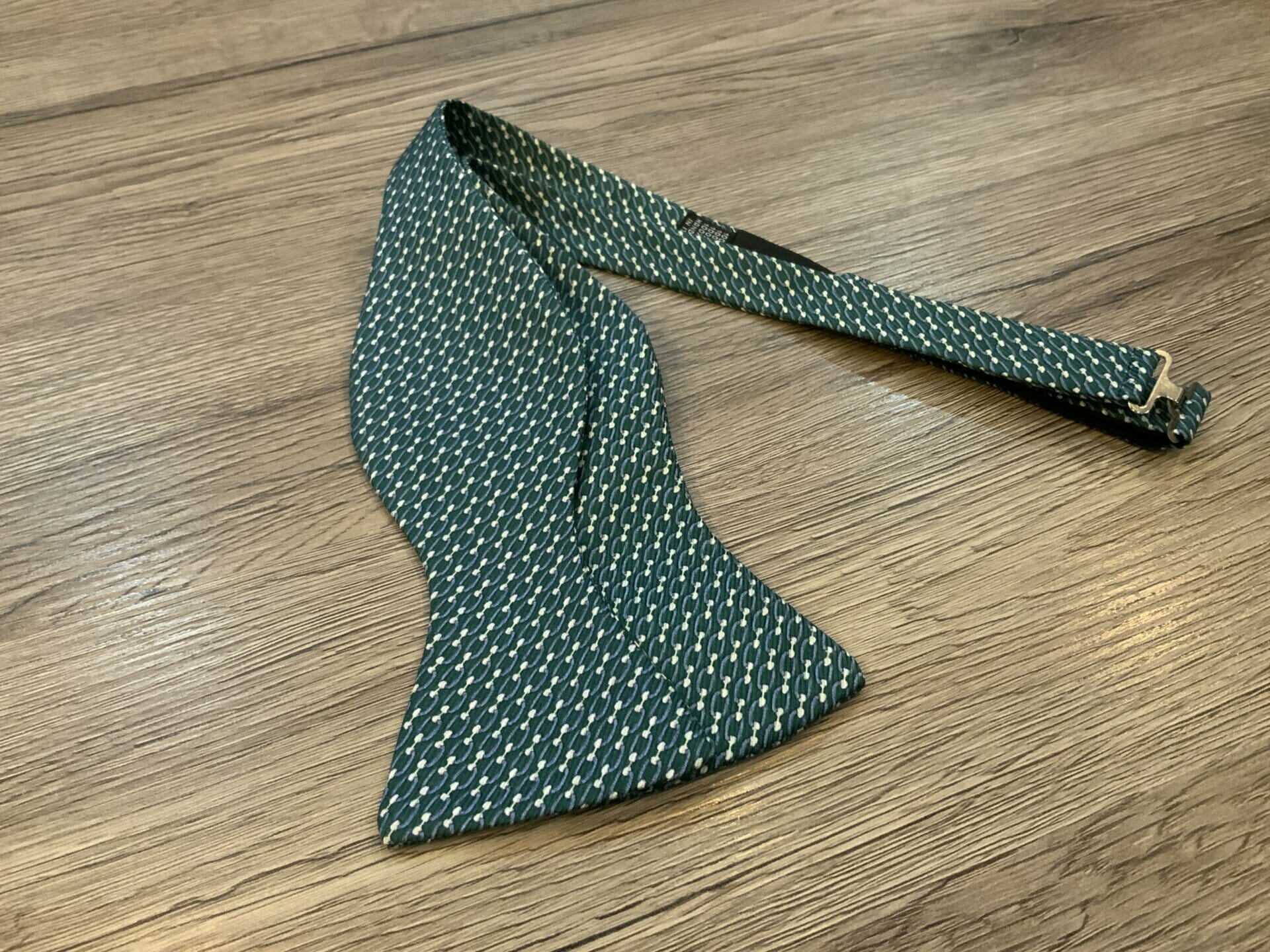 Papillon tagliato e cucito a mano da annodare e con collare regolabile, realizzato in seta 100% con fondo in verde e disegni in bianco e celeste.