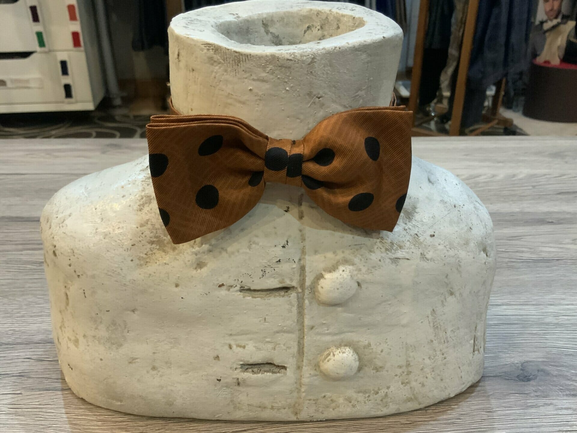 Papillon tagliato e cucito a mano con collare regolabile, realizzato in seta rasata 100% fondo marrone chiaro con pois in nero.