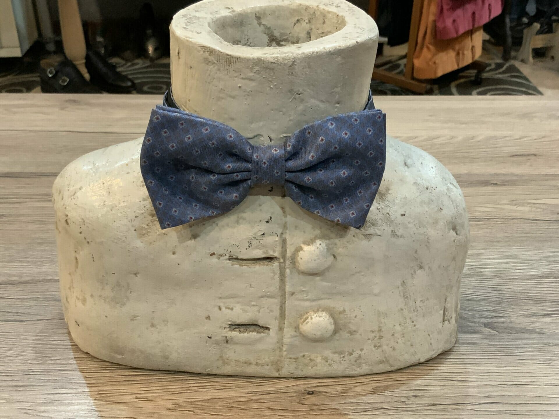 Papillon tagliato e cucito a mano con collare regolabile, realizzato in seta 100% fondo celeste con stampa rosso, grigio e bianco.