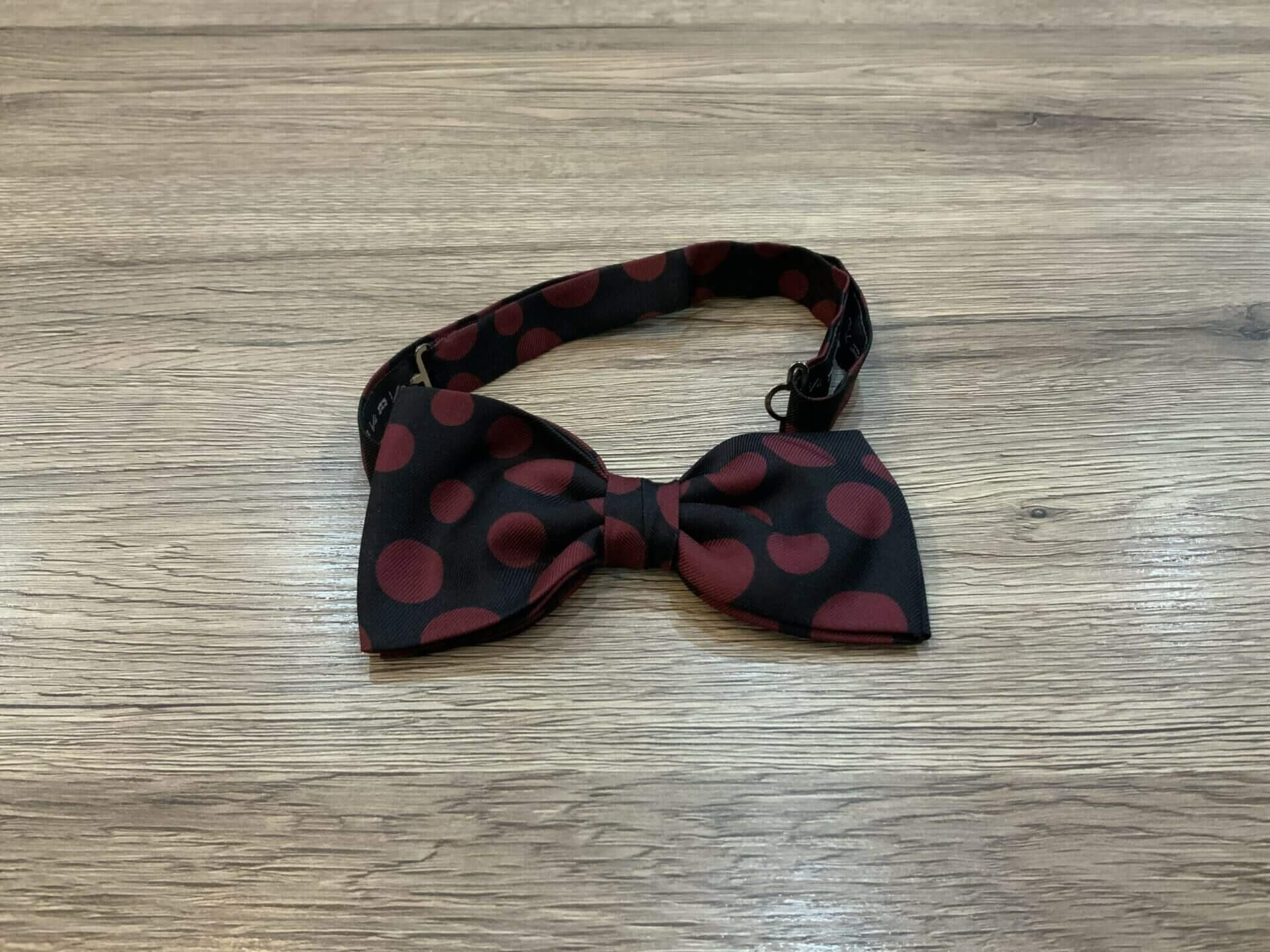 Papillon tagliato e cucito a mano con collare regolabile, realizzato in seta 100% con fondo in nero e pois in bordeaux.